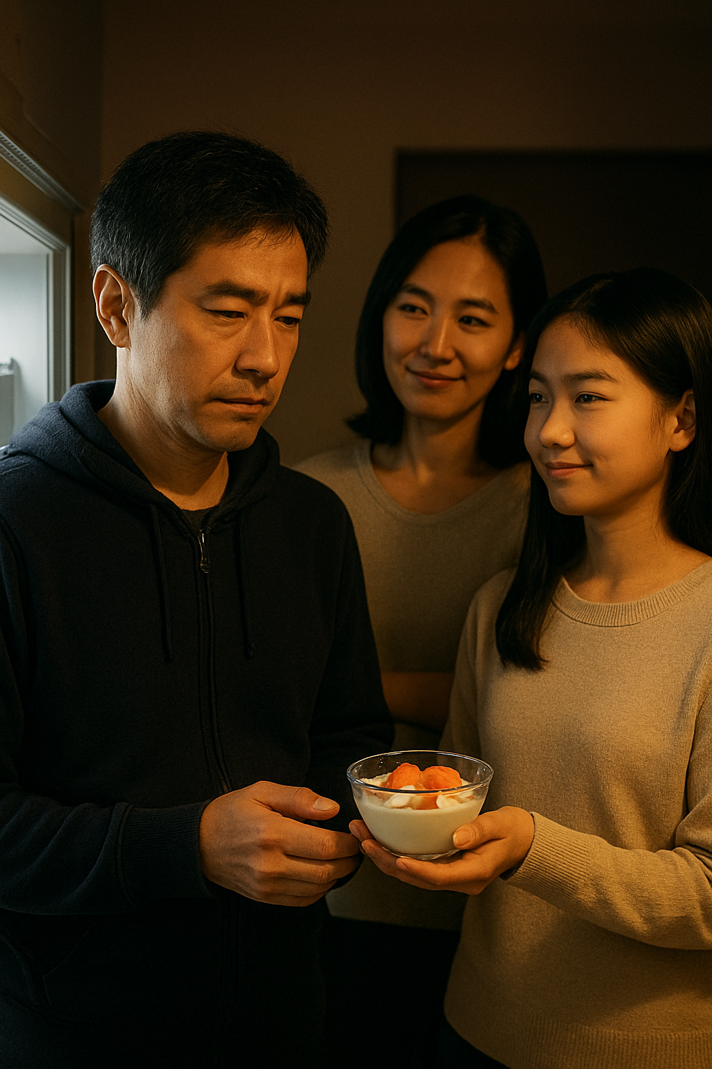 彼はアイスクリームから手を離し、代わりに娘が差し出したヨーグルトと果物のデザートを受け取る。ひと口食べると、爽やかな甘さが広がった。