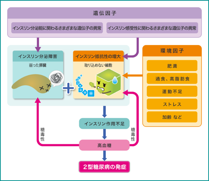 インスリン抵抗性とインスリン分泌不全の悪循環がインスリン作用不足(インスリンの働きが弱くなる)となり、2型糖尿病の原因となります。