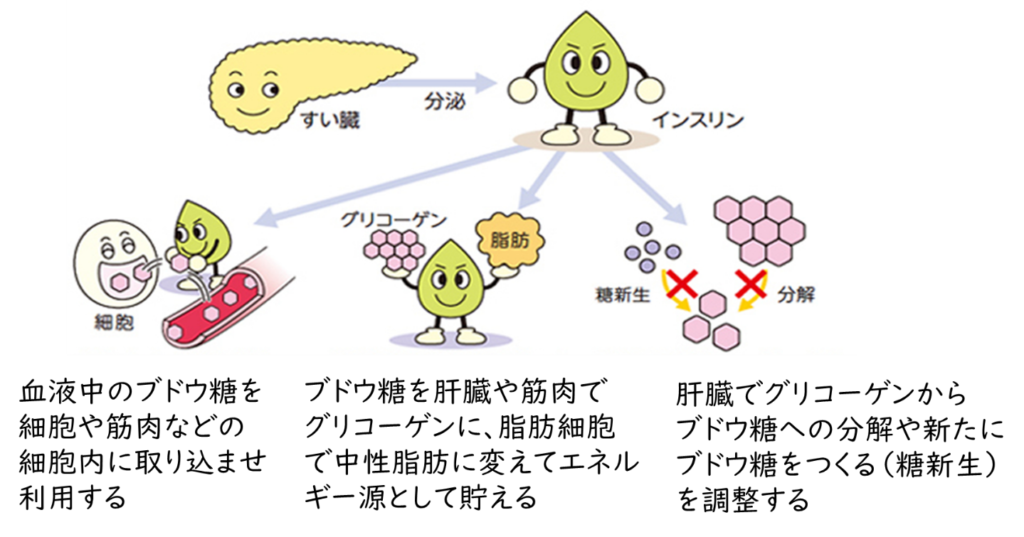 インスリンは、膵臓のβ細胞から分泌されるホルモンで、主に以下のような働きを持っています。