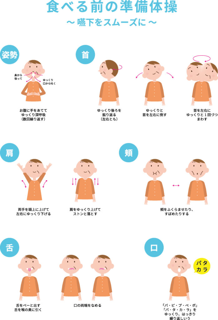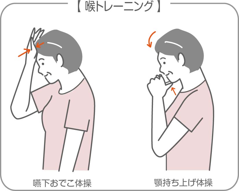 代表的なものに嚥下体操・嚥下おでこ体操・顎持ち上げ体操などがあげられます。