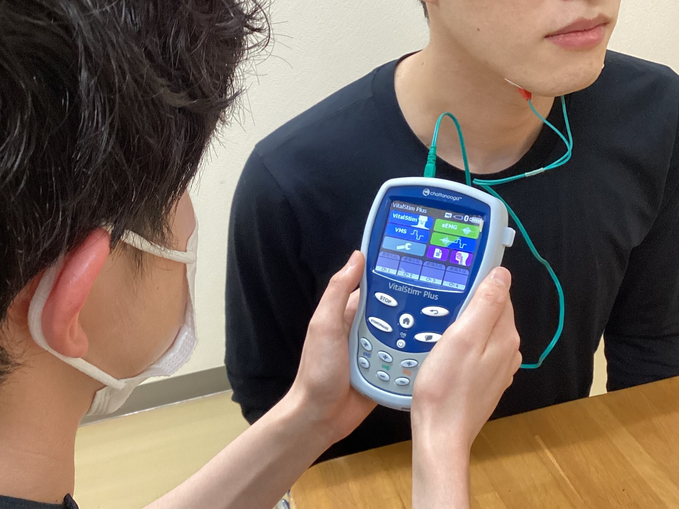 当院では、電気刺激を用いた訓練(バイタルスティムプラス)を実施しております。これは、経皮的に電気刺激を行い、嚥下の筋肉を促通し、機能の維持・向上を図ることができます。対象として、脳血管障害の後遺症による嚥下障害だけではなく、肺炎・加齢による嚥下障害の方も訓練で実施しております。