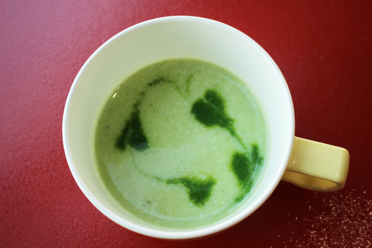 4、その間に上に飾るクレソンの浮身を作る。葉をやわらかく湯がき、粗ミジン切りし、冷たいブイヨン(温かいスープを使用するとクレソンの色が悪くなるため)と塩を少々とオリーブ油(あく抜き効果)を加え粒が残らないようにミキサーし濾す。そして使用直前に温めて浮身として使う(そうすることで色鮮やかなまま使用できる)。