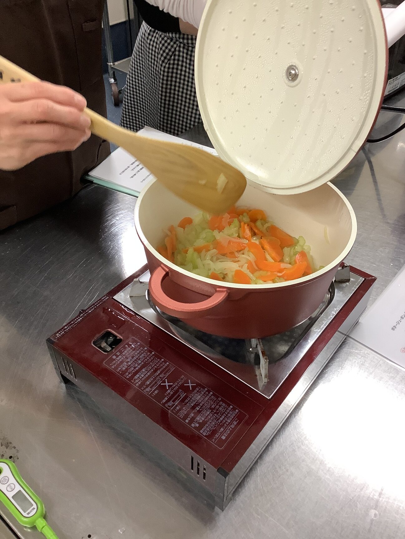 野菜の切り方について、大きさが少々不揃いのところもあったため、大きさをそろえる理由について、「具材の火の通りが均一になり同じ時間に炊きあがる。余分に煮る時間がかからなくなる。」と語ってくださいました。また、具材を指先で押した際に、抵抗なくつぶれるようになれば、煮え具合の目安になる。」と実践を交えて教えて頂きました。