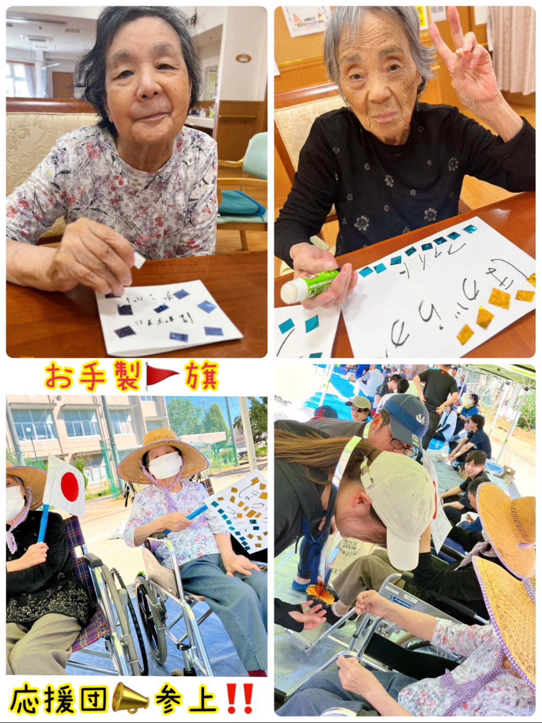 前日にはご入居者様が手作りで応援旗とメダルを作っていただき、当日もしっかりと