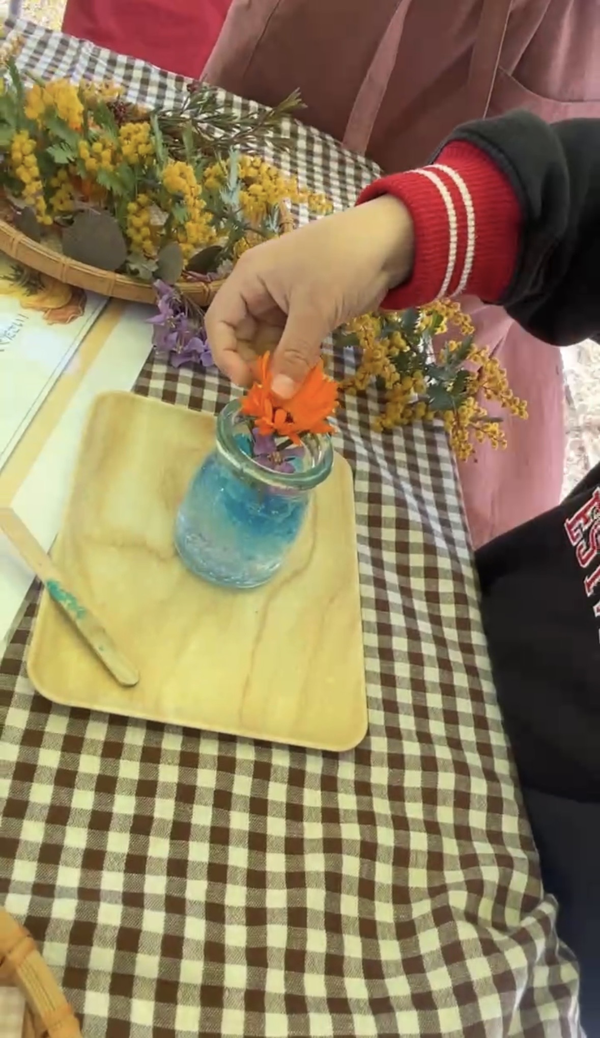 アロマ芳香ジェルでは紫菜花やキンセンカを飾り、香りとともに目で見ても楽しめるジェルが作られておりとても楽しそうです😊