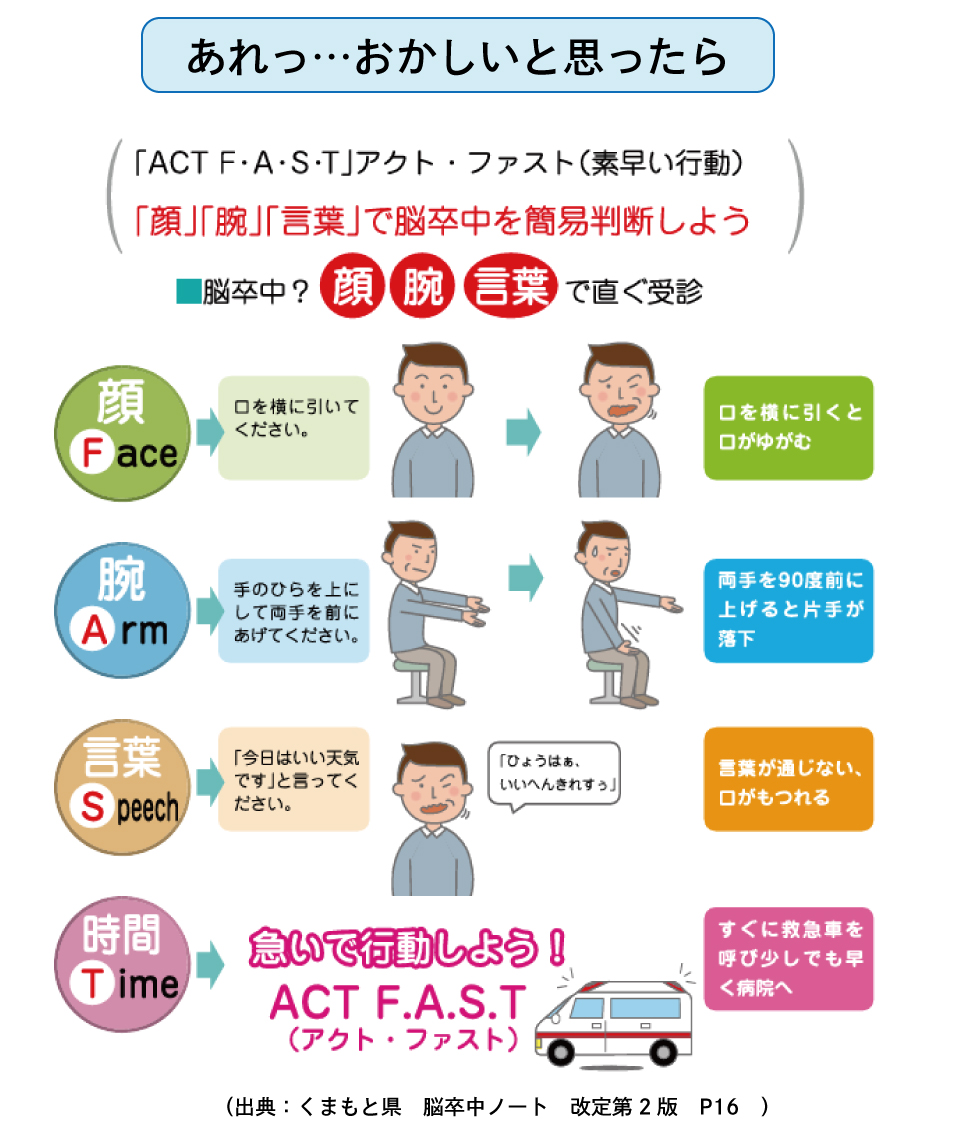 症状がたくさんあってわかりづらいですね。そこで、だれでも脳卒中の初期症状が簡易判断できるように、FASTを確認することが大切です。