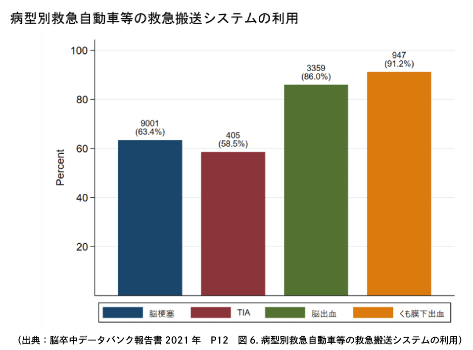 脳出血やクモ膜下出血が9割近い搬送率であるのに対し、脳梗塞は6割程度の搬送率にとどまっています。激しい頭痛もなく、何かおかしい程度の症状であれば、すぐに救急搬送に至らないのかもしれません。