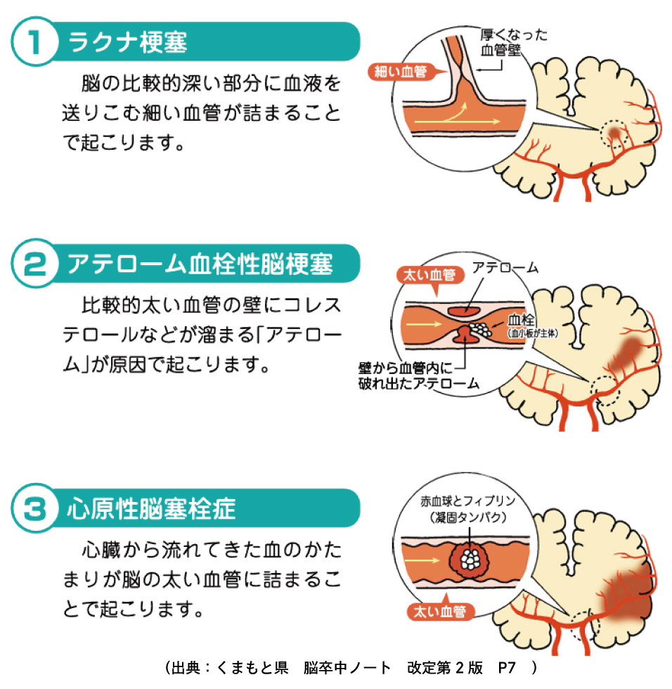 脳卒中とは、血管が詰まる「脳梗塞」と、血管が破れる「脳出血」、血管にできた瘤が破れる「クモ膜下出血」に分かれます。さらに、脳梗塞は、細い血管が詰まる「ラクナ梗塞」、比較的太い血管が詰まる「アテローム血栓性脳梗塞」、心臓で出来た血栓が脳の太い血管に詰まる「心原性脳塞栓症」に分かれます。