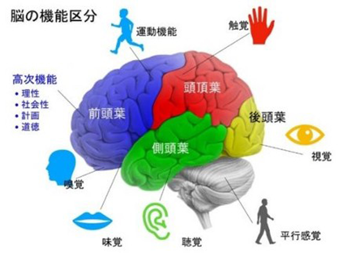 脳にはそれぞれ、場所によって役割が決まっていて、障害された部位に応じて、さまざまな症状を呈します。例えば、図のように、前頭葉(脳の前の方)では、麻痺や性格変化 側頭葉では言葉の理解、後頭葉(後ろの方)では目の症状 小脳では平衡感覚の症状など多岐にわたります。 |