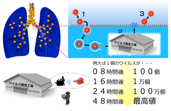 (のりでくっついて吸収され、ウイルス製造工場で増えて、はさみで切って外に出ていく)