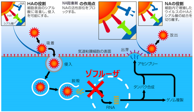 イメージしやすいように絵を載せますが、ヘマグルチニンがべたべたした「のり」で、ノイラミニダーゼが「はさみ」としてそのはさみを薬によって使えなくしてしまえば・・・