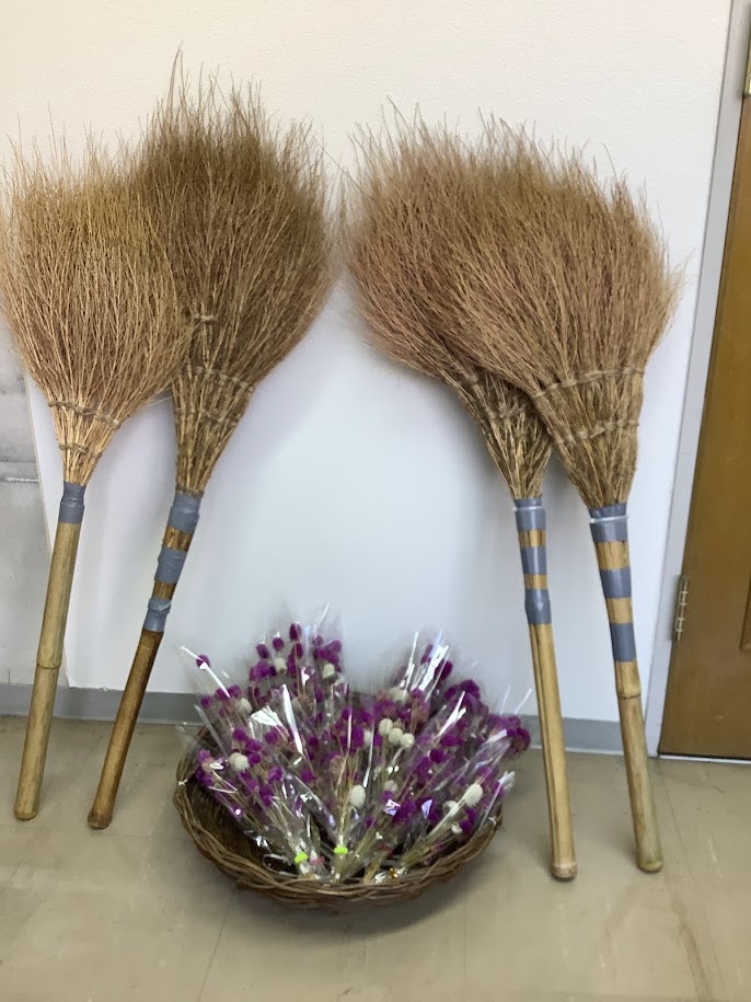 今回、なんと宿直さん手づくりのほうき草から育てて作ったほうき、ドライフラワーのプレゼントもあり、ステキなサプライズでした。